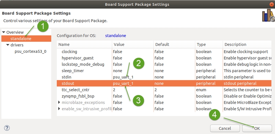 整體流程可參考 hackster.io 這篇,比較需要注意的是設定standalone BSP時A53的stdin,stdout要設定uart1,否則console會看不到任何訊息